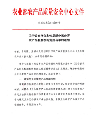 海南威爾公司成功獲得農業(yè)部無(wú)公害農產(chǎn)品檢測資格