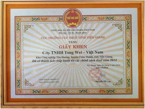 越南通威獲“2014年度稅務(wù)政策和納稅義務(wù)執行優(yōu)秀企業(yè)”稱(chēng)號