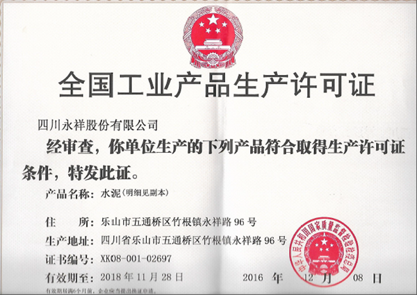 永祥水泥順利取得P·O52.5R水泥生產(chǎn)許可證